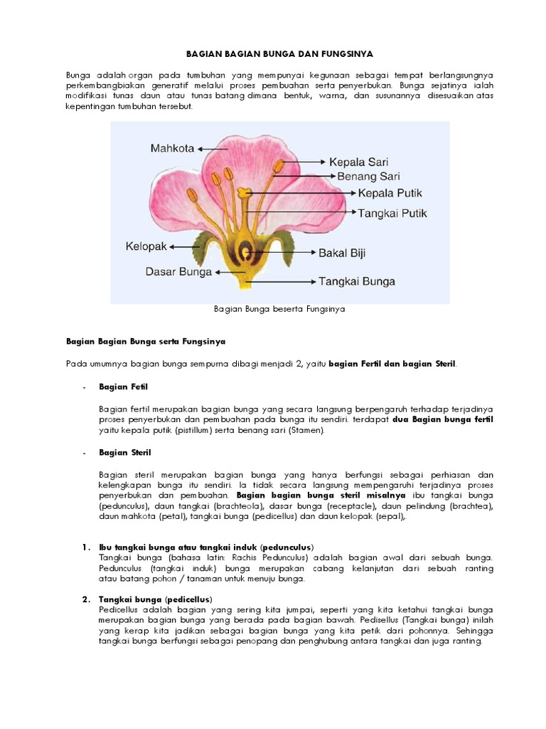 Bunga merupakan tanaman yang banyak disukai oleh kaum wanita, selain bentuknya yang indah, warnanya menarik dan juga memiliki aroma yang wangi. Susunan bunga di dalam tangkai disebut dengan istilah pembungaan. Bagian ini berfungsi melindungi mahkota pada saat kuncup. Bagian bagian bunga 2 menunjukkan bagian bagian bunga id: Bunga dikatakan lengkap apabila mempunyai daun kelopak ,daun mahkota, benang sari,putik,dan daun buah.