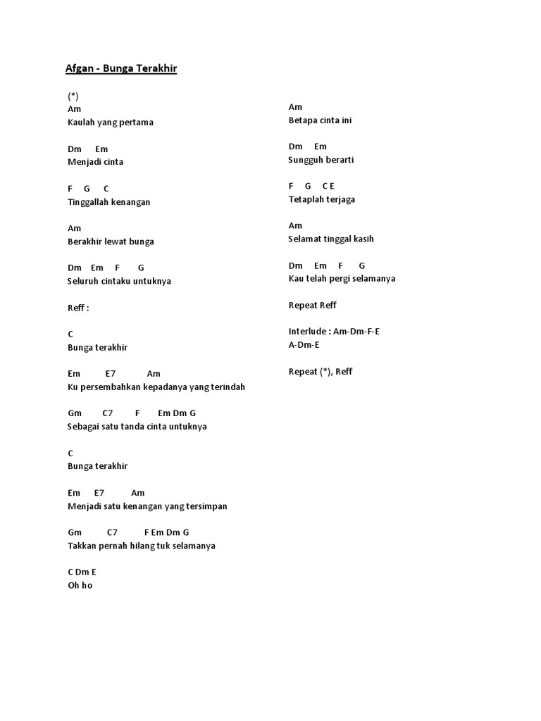 1 from There is no strumming pattern for this song yet. Lagu ini sering dinyanyikan ulang, termasuk oleh penyanyi solo, afgan. Berikut ini yang (mungkin) masih berkaitan dengan : Berikut lirik dan chord lagu bunga terakhir dari bebi romeo. Subcribe untuk mendapatkan update lagu terbaru lainnya. Kaulah yang pertama menjadi cinta tinggallah kenangan berakhir lewat bunga seluruh cintaku untuknya. Lirik dan chord lagu bunga terakhir versi afgan. Bunga terakhir ku persembahkan kepada yang terindah.